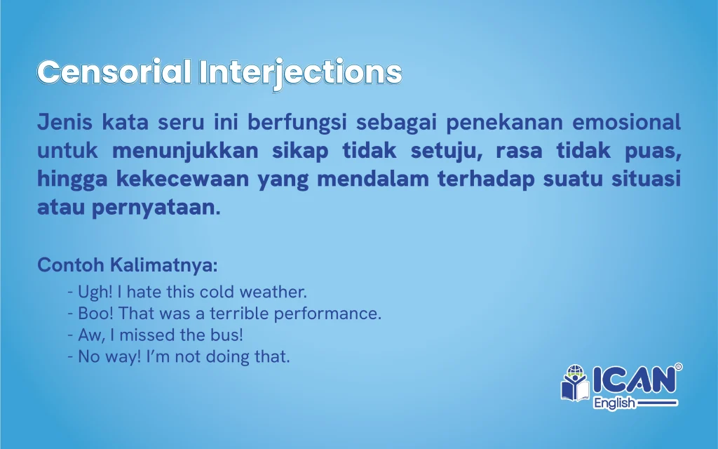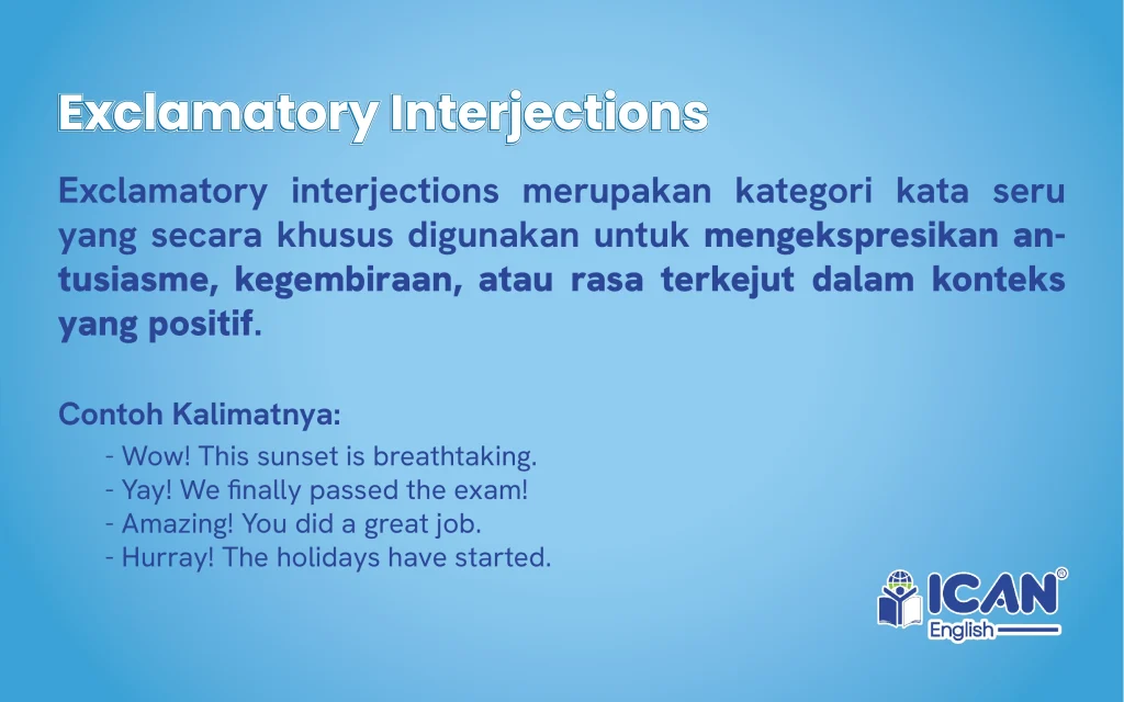 Memahami penggunaan interjection yang tepat sangatlah penting agar komunikasi bahasa Inggris kamu terdengar lebih natural dan tidak kaku, layaknya seorang penutur asli (native speaker). Di ICAN English, kamu akan dibimbing untuk menguasai berbagai ekspresi emosional ini melalui metode pembelajaran yang interaktif. Dengan bergabung bersama ICAN English, kamu tidak hanya belajar tata bahasa secara teoritis, tetapi juga dilatih untuk menggunakan interjection dalam konteks yang tepat sehingga kemampuan berbicara (speaking) kamu menjadi lebih luwes, percaya diri, dan penuh warna saat berinteraksi di dunia internasional. Jadi tunggu apalagi ayo bergabung bersama ICAN English!