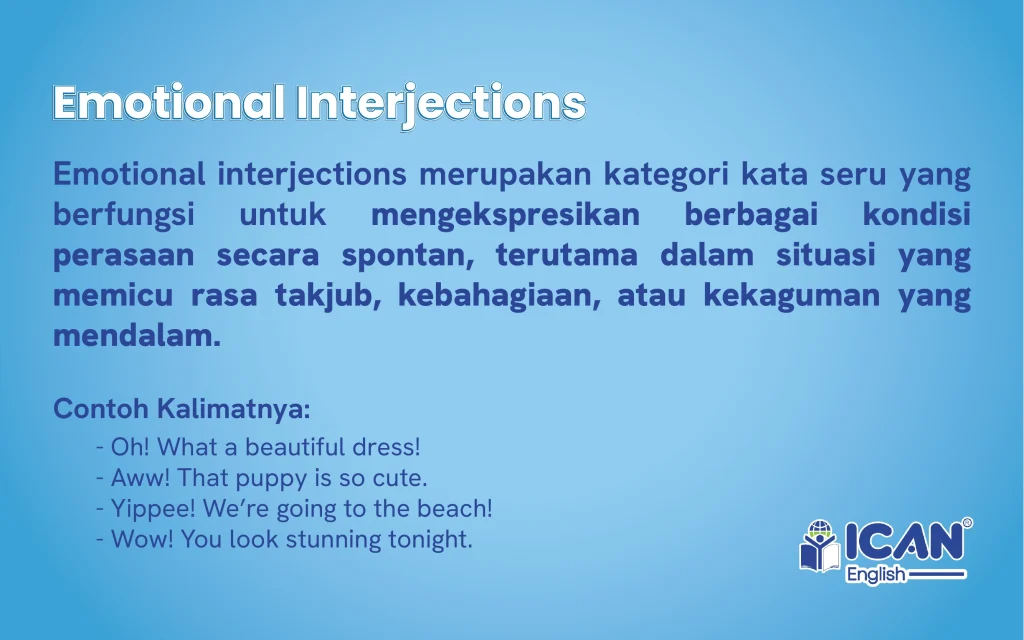 Interjection atau kata seru merupakan elemen bahasa yang berfungsi sebagai untuk mengekspresikan perasaan spontan seperti kegembiraan, kekecewaan, persetujuan, hingga rasa terkejut tanpa memerlukan struktur kalimat yang rumit. Secara fungsional, interjection terbagi ke dalam beberapa kategori, mulai dari volitional untuk mengarahkan tindakan, exclamatory untuk antusiasme, censorial untuk menunjukkan ketidaksetujuan, hingga emotional untuk mengungkapkan kekaguman. Penggunaan kata-kata seperti “Wow!”, “Oops!”, atau “Shh!” tidak hanya menghidupkan suasana dalam percakapan sehari-hari, tetapi juga memberikan nyawa pada penulisan kreatif agar pesan yang disampaikan terasa lebih jujur dan ekspresif.