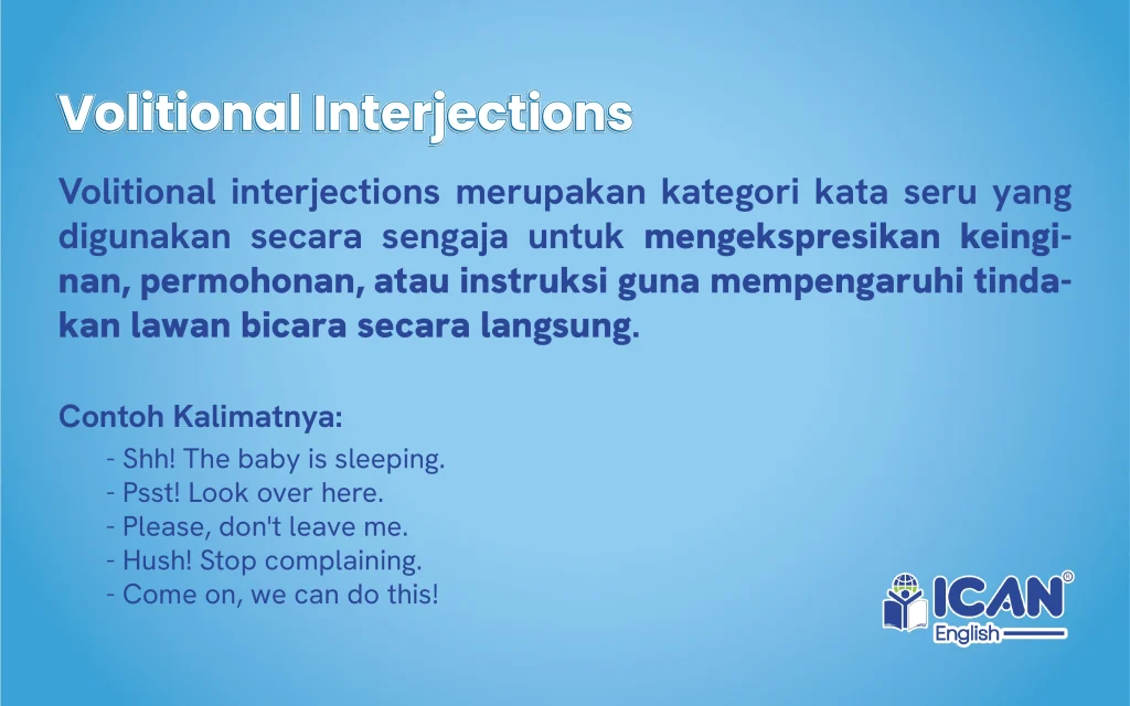 Berbeda dengan reaksi emosional yang bersifat refleks, jenis ini berfungsi sebagai alat komunikasi praktis untuk mengarahkan perhatian, menunjukkan otoritas, atau memberikan dorongan semangat secara instan tanpa memerlukan penjelasan panjang lebar. Penggunaannya dalam kalimat perintah maupun ungkapan harapan membuat pesan yang disampaikan terasa lebih tegas, efektif, dan memiliki penekanan khusus baik dalam situasi formal maupun informal.