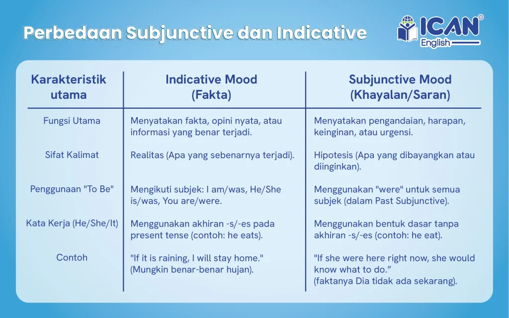 Secara sederhana, subjunctive adalah bentuk mood atau suasana kalimat yang digunakan untuk mengekspresikan hal-hal yang tidak nyata, pengandaian, harapan, hingga saran yang sifatnya mendesak. Berbeda dengan kalimat pernyataan fakta, subjunctive membawa kamu masuk ke dunia “bagaimana jika” dan memberikan warna tersendiri dalam cara kita berkomunikasi.